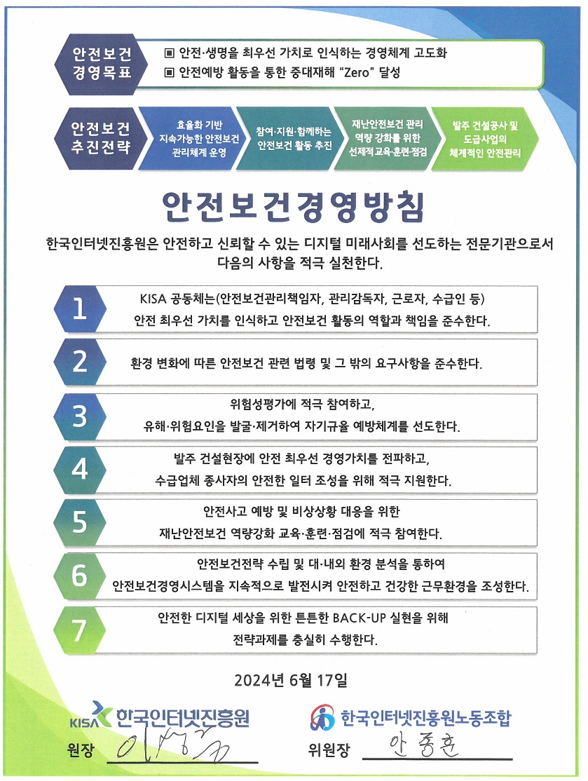 KISA 한국인터넷진흥원 원장 이상중 한국인터넷진흥원노동조합 위원장 안종훈