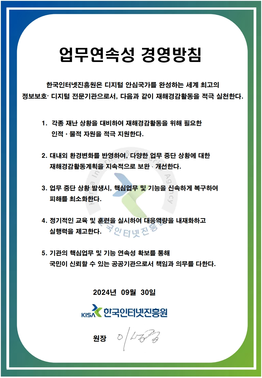 한국인터넷진흥원은 디지털 안심국가를 완성하는 세계 최고의 정보보호·디지털 전문기관으로서, 다음과 같이 재해경감활동을 적극 실천한다.