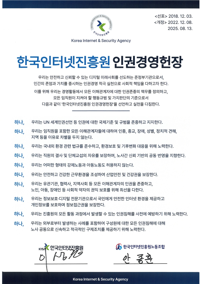 다음과 같이 '한국인터넷진흥원 인권경영헌장'을 선언하고 실천을 다짐한다.